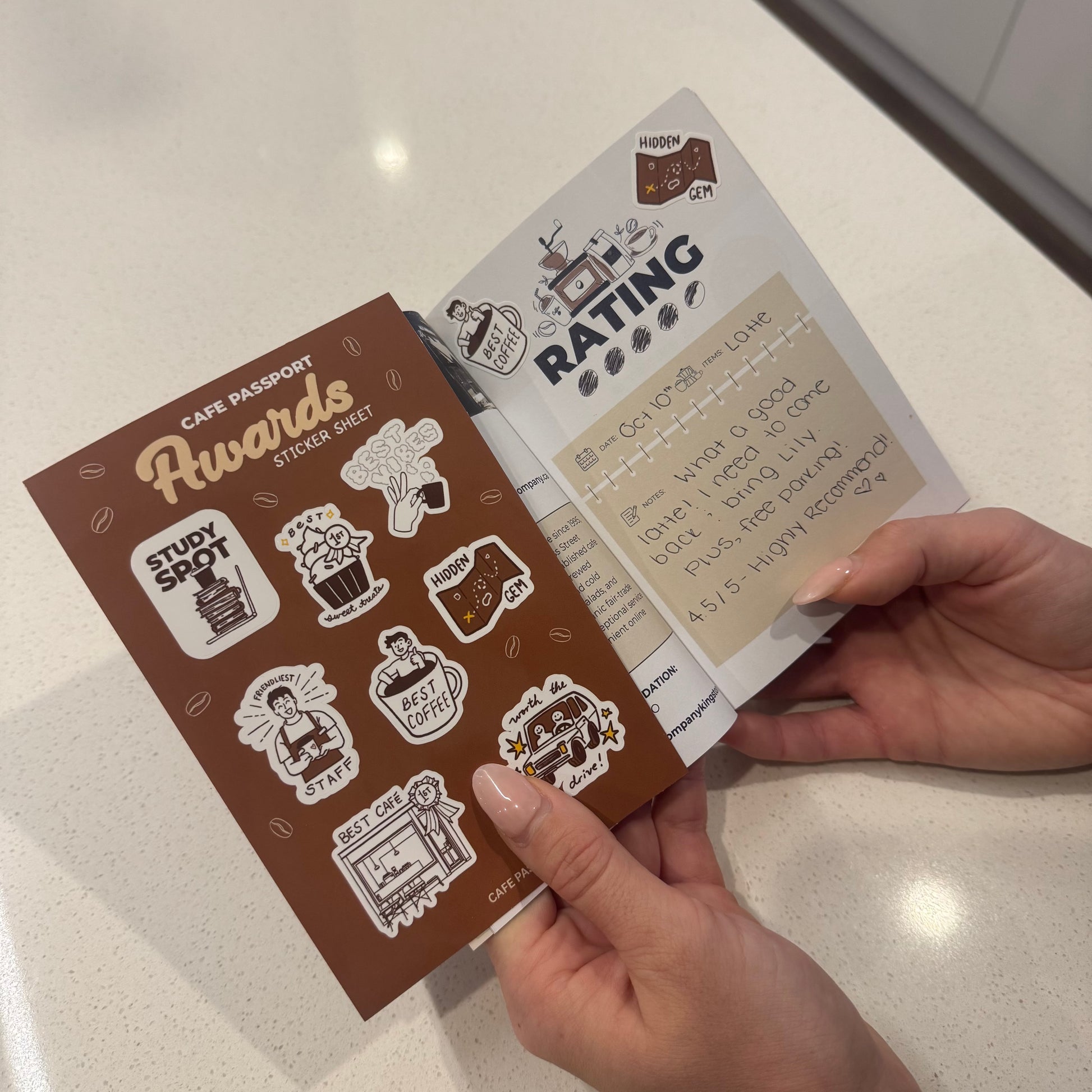 This 4" x 6" sticker sheet includes eight unique “awards” you can peel and place right inside your Cafe Passport. As you explore, add a sticker to the page of the café that earns it.