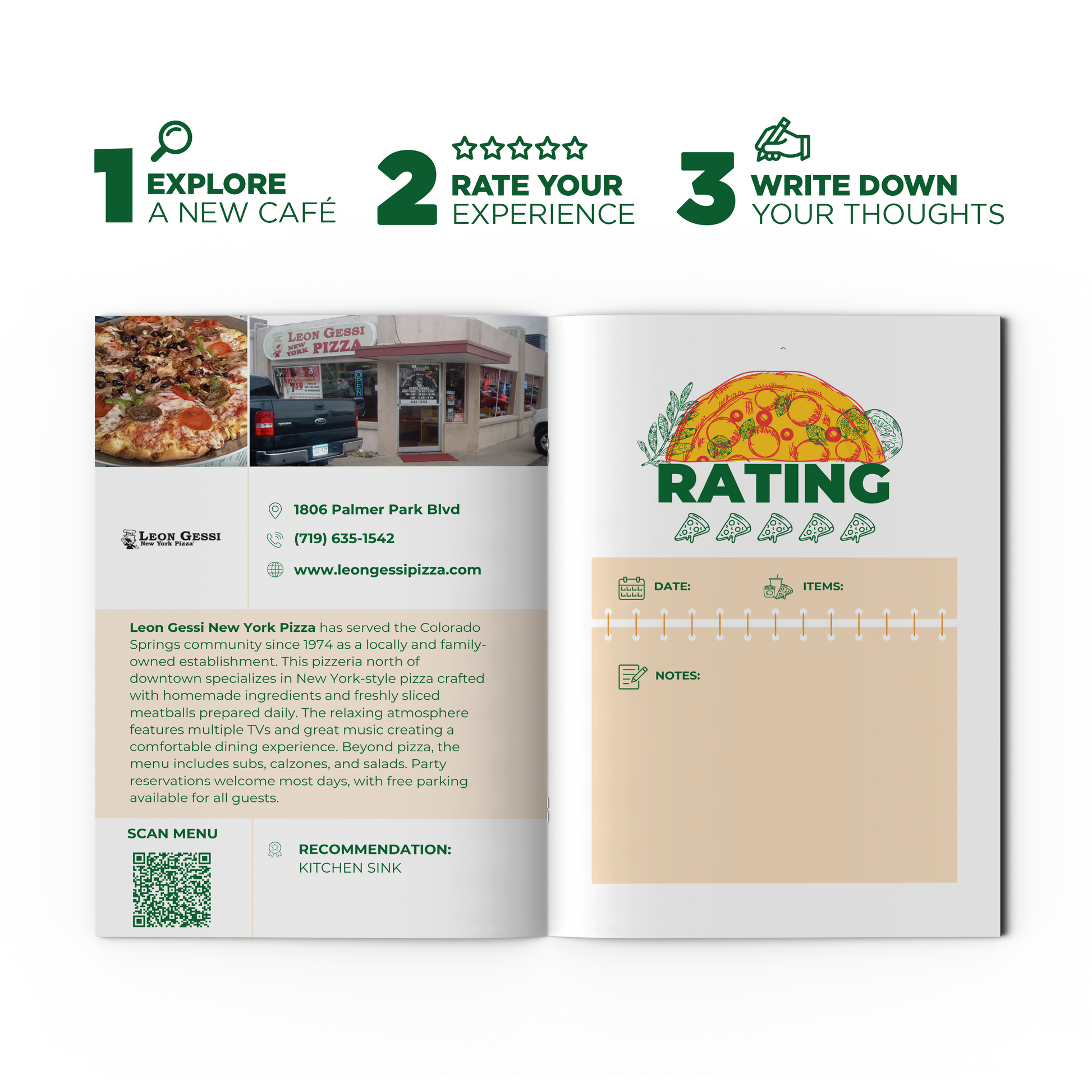 Born from our own slice-filled adventures, this pocket-sized Pizza Passport highlights handpicked pizzerias across Colorado Springs and the surrounding areas. We created this guide as a fun way to track our favorite spots around the city. Each pizzeria has its own dedicated page with a short description and slice recommendation. Rate each spot out of 5, jot down your notes, and challenge yourself to visit them all. Whether you're a local or just visiting, this passport invites you to experience the incredible variety of pizza that makes Colorado Springs so special. We've even included blank pages in the back for hidden gems you discover along the way.