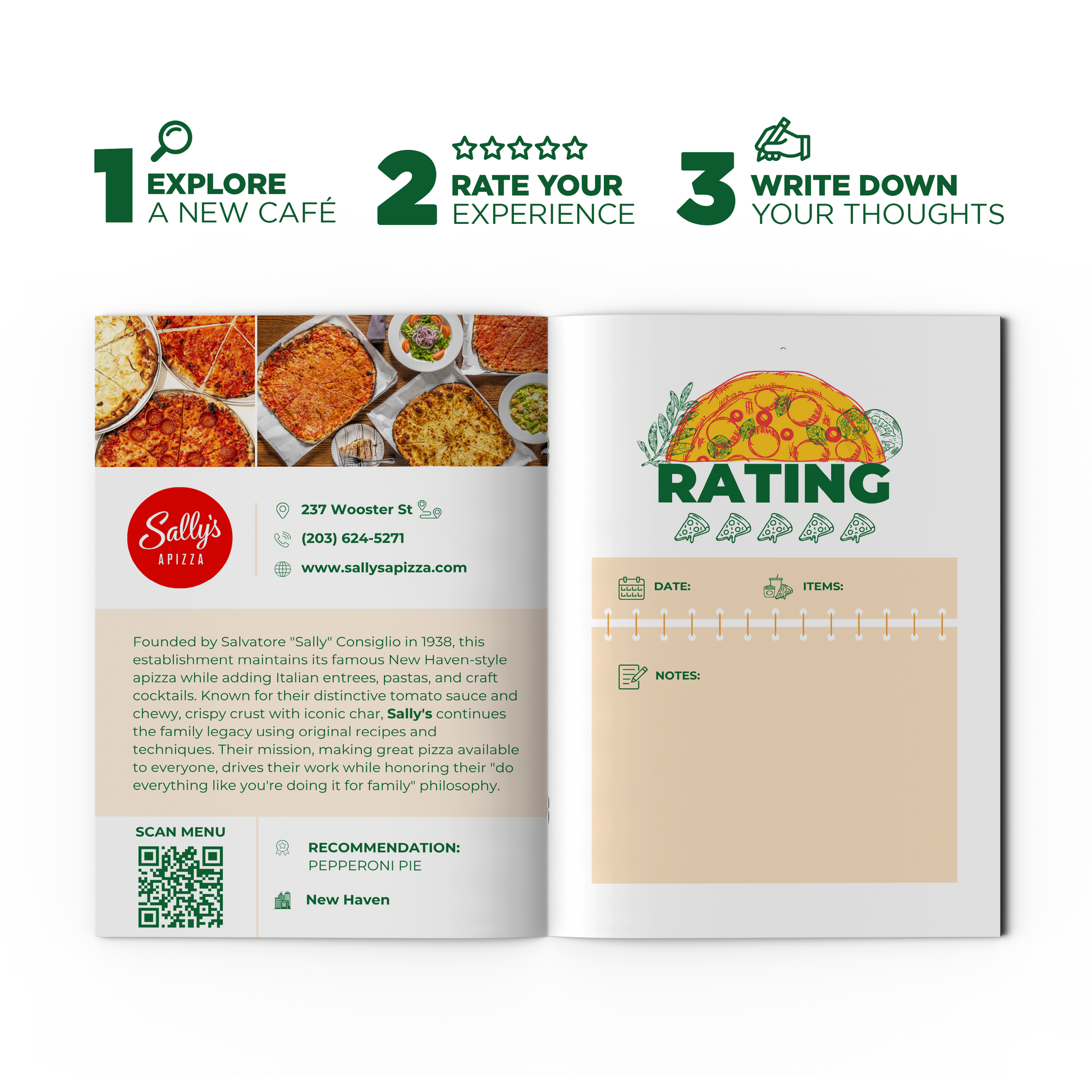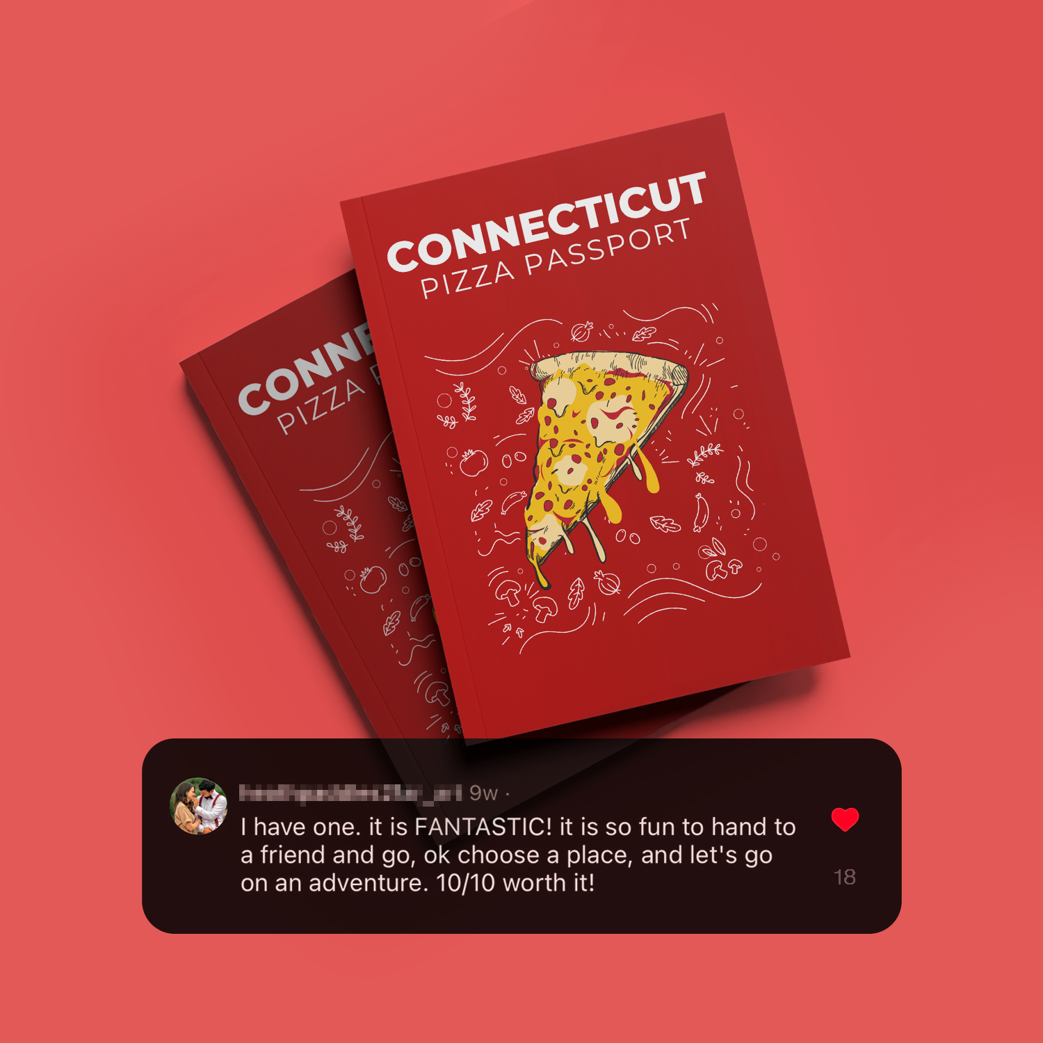 Born from our own pizza-fueled adventures, this pocket-sized Pizza Passport features handpicked spots across Connecticut. We created this guide because we wanted a fun way to document our favorite slices from around the state. Each pizzeria has its own dedicated page with a description and slice recommendation. Try a new spot, rate it out of 5, and challenge yourself to visit them all. Whether you're a local or just passing through, this passport gives you a delicious reason to explore Connecticut’s legendary pizza scene, and make some tasty memories while you're at it. We've even included blank pages at the back for you to jot down hidden gems you discover along the way.