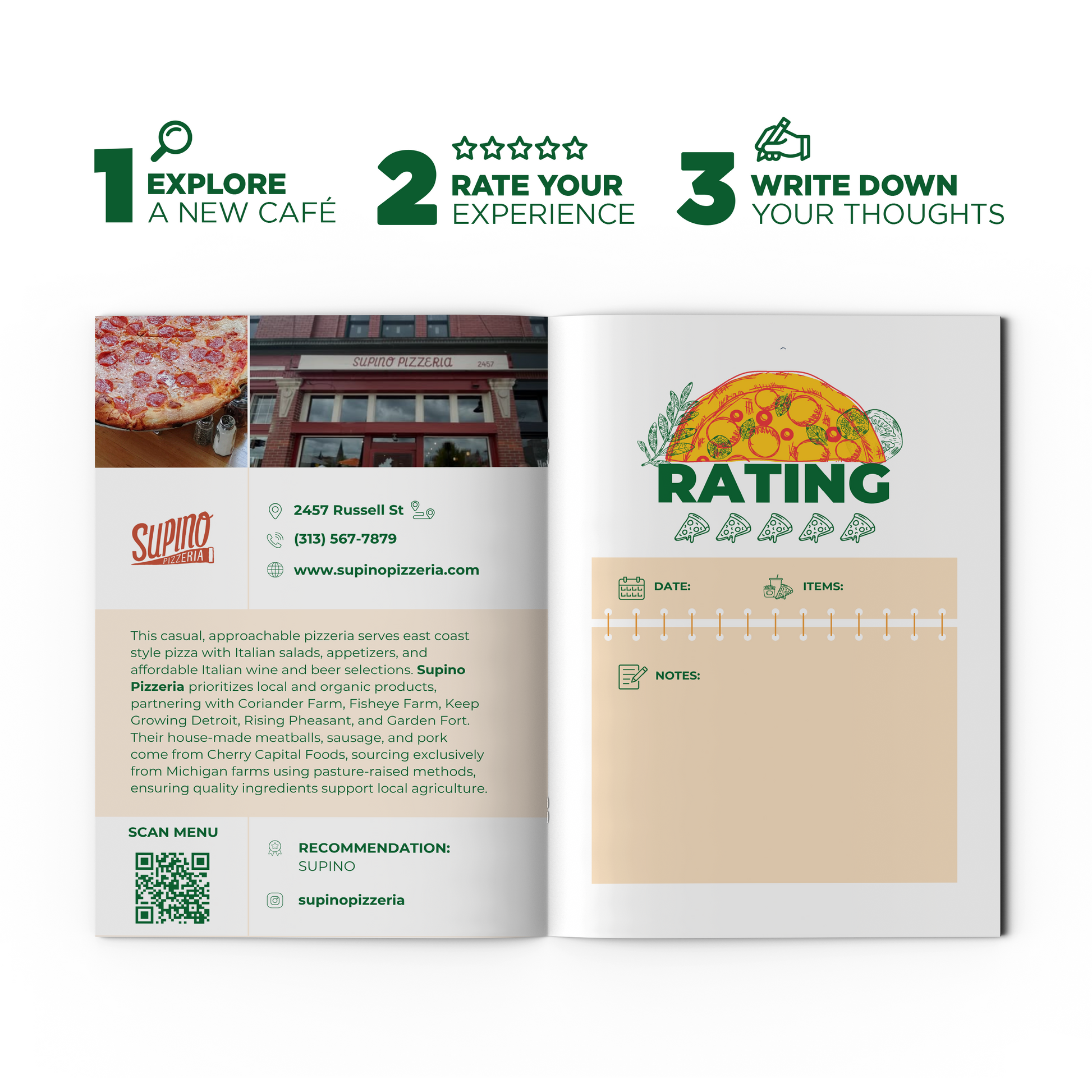 Born from our own pizza-fueled adventures, this pocket-sized Pizza Passport features handpicked spots across Detroit. We created this guide as a fun way to track our favorite slices around the city. Each pizzeria has its own dedicated page with a description and slice recommendation. Try a new spot, rate it out of 5, and challenge yourself to visit them all. Whether you're a lifelong local or just visiting, this passport gives you a delicious reason to dive into Detroit’s iconic pizza scene, and make some cheesy memories while you're at it. There are even blank pages in the back for jotting down hidden gems you find along the way.