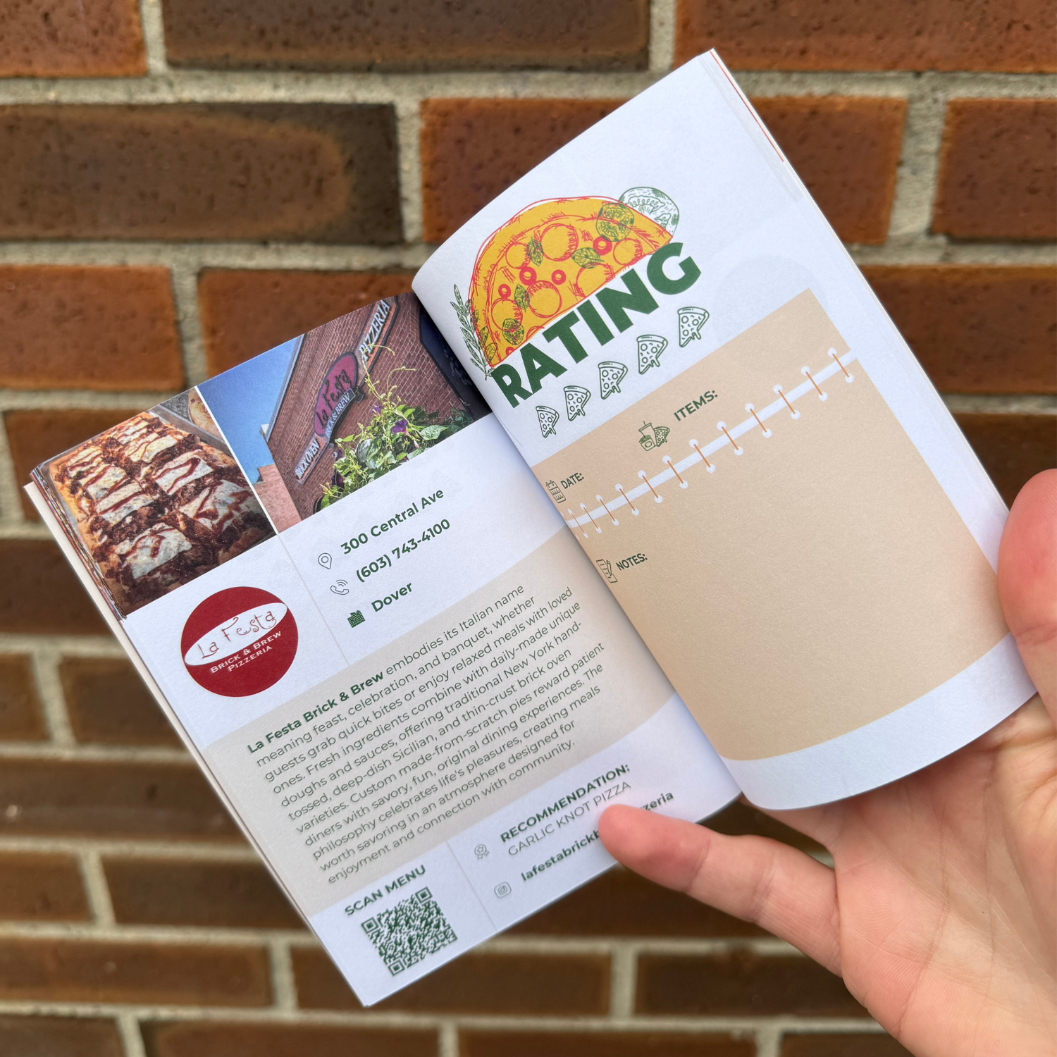 Born from our own slice-filled adventures, this pocket-sized Pizza Passport highlights handpicked pizzerias across New Hampshire and the surrounding areas. We created this guide as a fun way to track our favorite spots throughout the state. Each pizzeria has its own dedicated page with a short description and slice recommendation. Rate each spot out of 5, jot down your notes, and challenge yourself to visit them all. Whether you're a local or just visiting, this passport invites you to experience the incredible variety of pizza that makes New Hampshire so special. We've even included blank pages in the back for hidden gems you discover along the way.