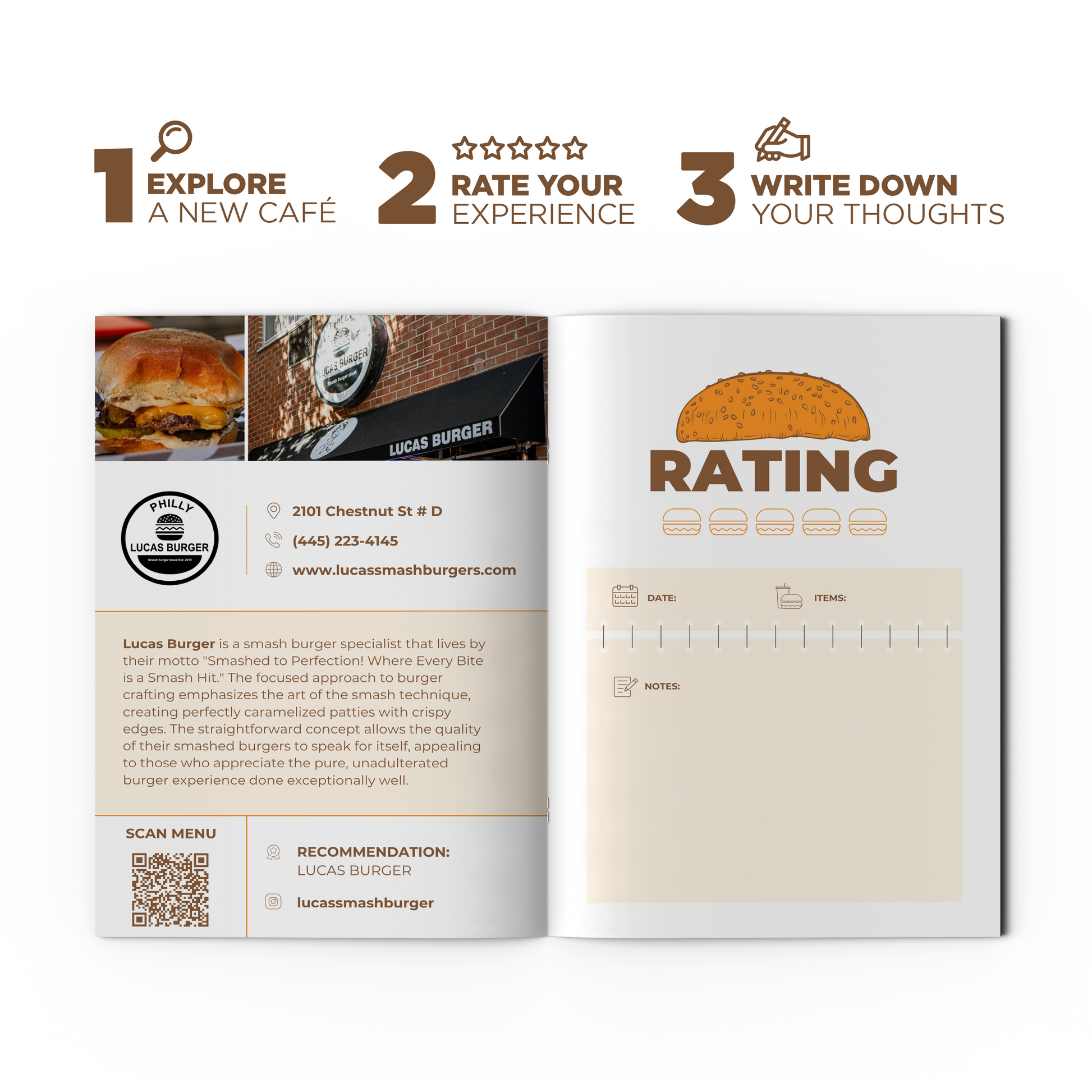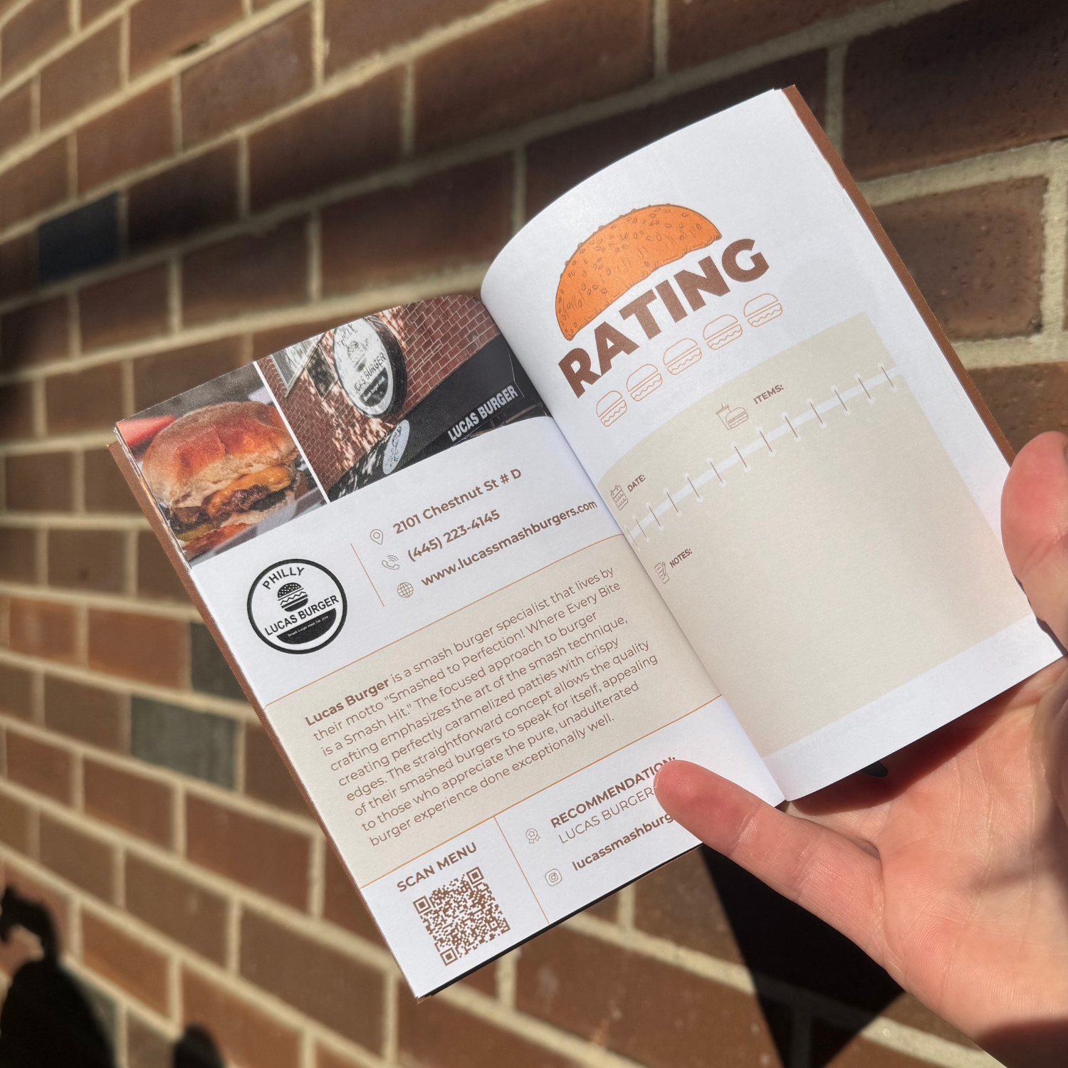 Born from our own burger-fueled adventures, this pocket-sized Burger Passport features handpicked spots across Philadelphia. We created this guide because we wanted a fun way to document our favorite bites around the city. Each burger joint has its own dedicated page with a description and burger recommendation. Try a new spot, rate it out of 5, and challenge yourself to visit them all. Whether you're a local or just passing through, this passport gives you a delicious reason to explore Philadelphia’s booming burger scene, and make some tasty memories while you're at it. We've even included blank pages at the back for you to jot down hidden gems you discover along the way.