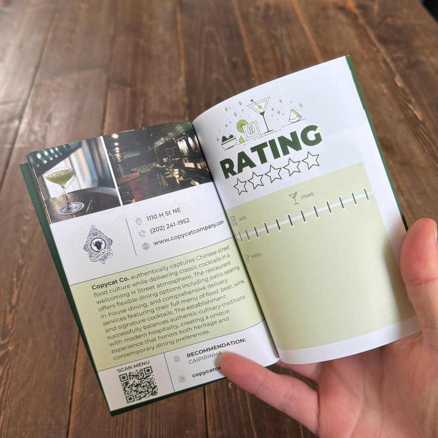 Born from our own love of craft drinks and hidden gems, this pocket-sized Cocktail Passport features handpicked bars and lounges across Washington D.C. We created it as a fun way to keep track of our favourite spots and push ourselves to try something new. Each bar has its own page with a short description and a recommended cocktail. Rate each stop, jot down notes, and see how many you can visit. Whether you're a local or just passing through, this guide gives you the perfect excuse to explore more of D.C.’s dynamic cocktail scene—and we’ve even included blank pages in the back for your own discoveries or future favourites.