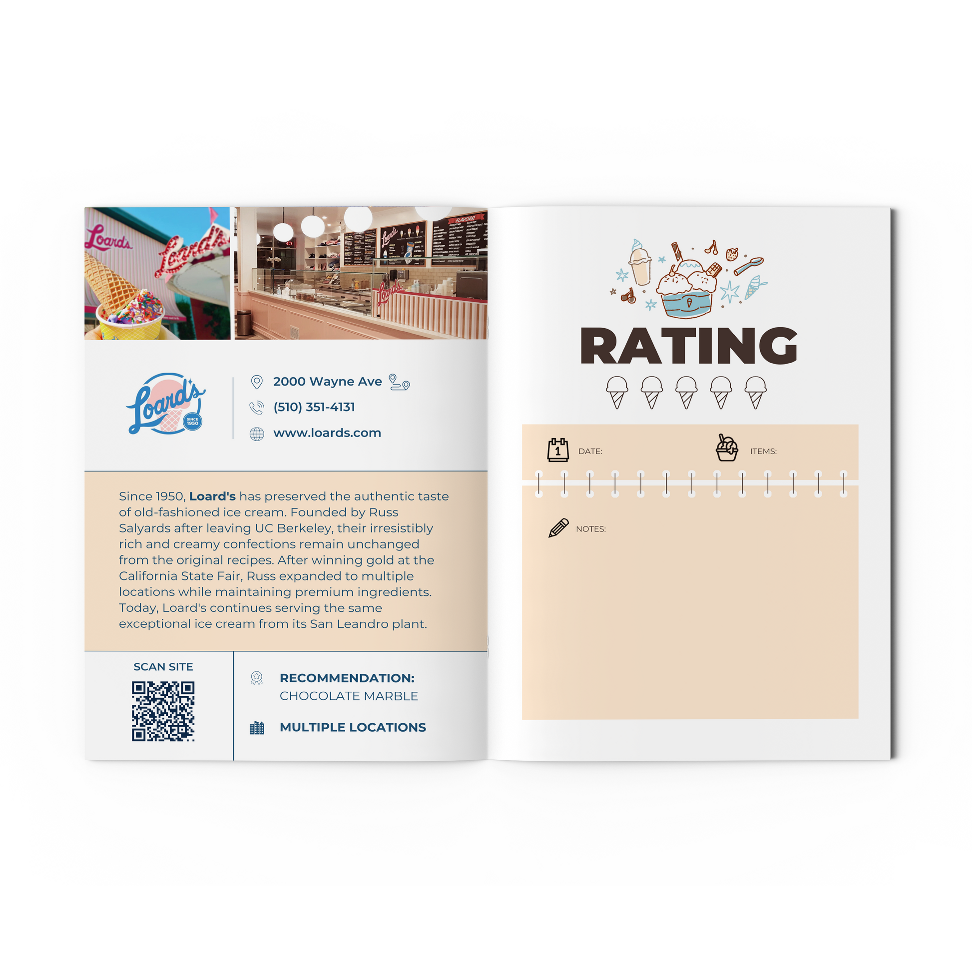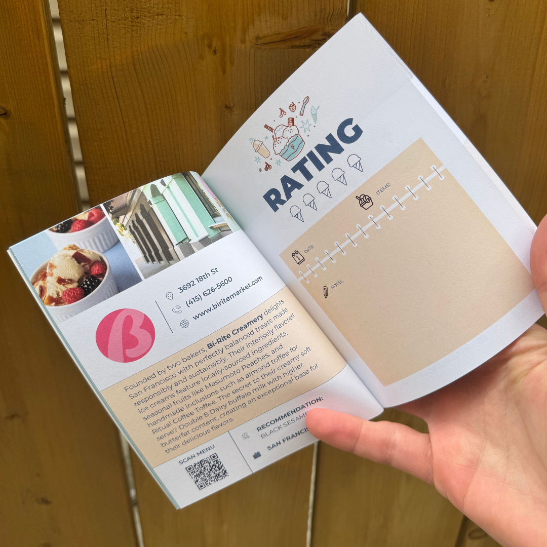 Born from our own sweet-toothed adventures, this pocket-sized Ice Cream Passport features handpicked scoop shops across the San Francisco Bay Area. We created this guide because we wanted a fun way to document our frozen discoveries around the region. Each ice cream shop has its dedicated page that includes a description and flavor recommendation. Explore a new spot, rate it out of 5, and challenge yourself to visit all scoop shops. Whether you're new to the Bay or just looking to break your routine, this passport gives you a reason to explore the Bay Area's diverse ice cream scene while creating lasting memories along the way. We've even left blank spots at the back for you to fill in with different ice cream shops and ones you visit while traveling.