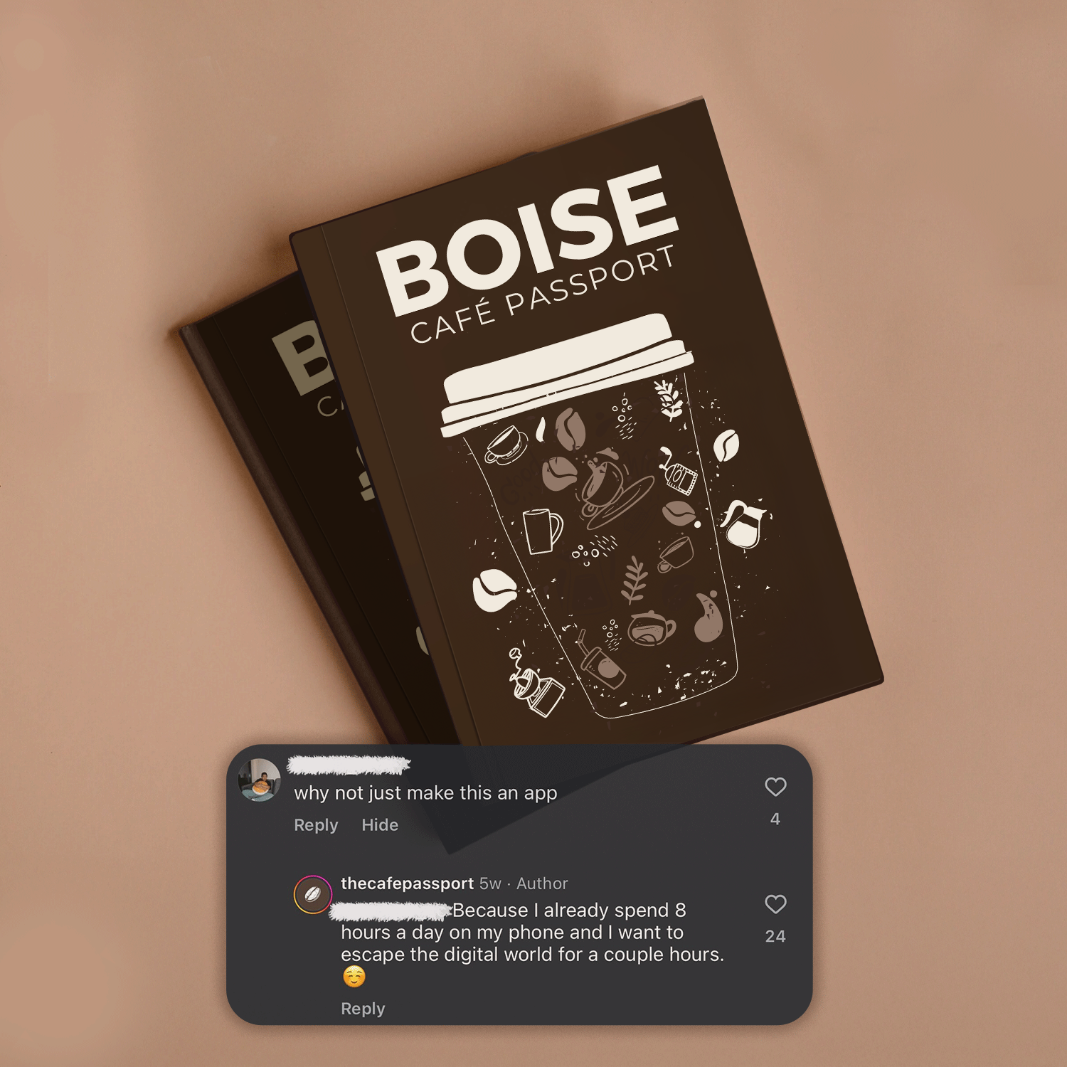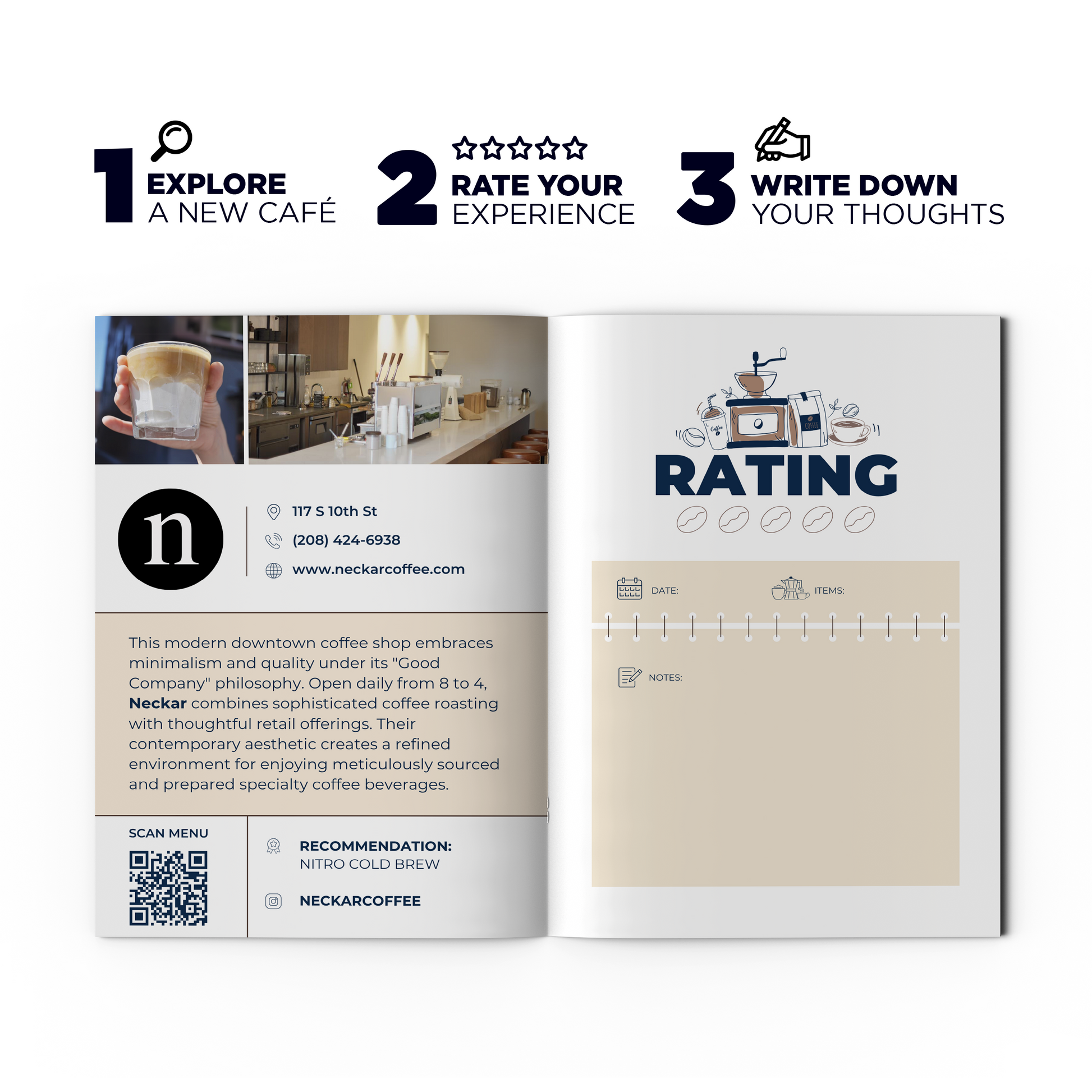 Born from our own caffeine-fueled adventures, this pocket-sized Cafe Passport features handpicked spots across Boise. We created this guide because we wanted a fun way to document our discoveries around the city. Each cafe has its own dedicated page that includes a description and drink recommendation. Explore a new spot, rate it out of 5, and challenge yourself to visit all the cafes. Whether you're new to town or just looking to break your routine, this passport gives you a reason to explore Boise's diverse coffee scene while creating lasting memories along the way. We've even left blank spots at the back for you to fill in with different cafes and ones you visit while traveling.