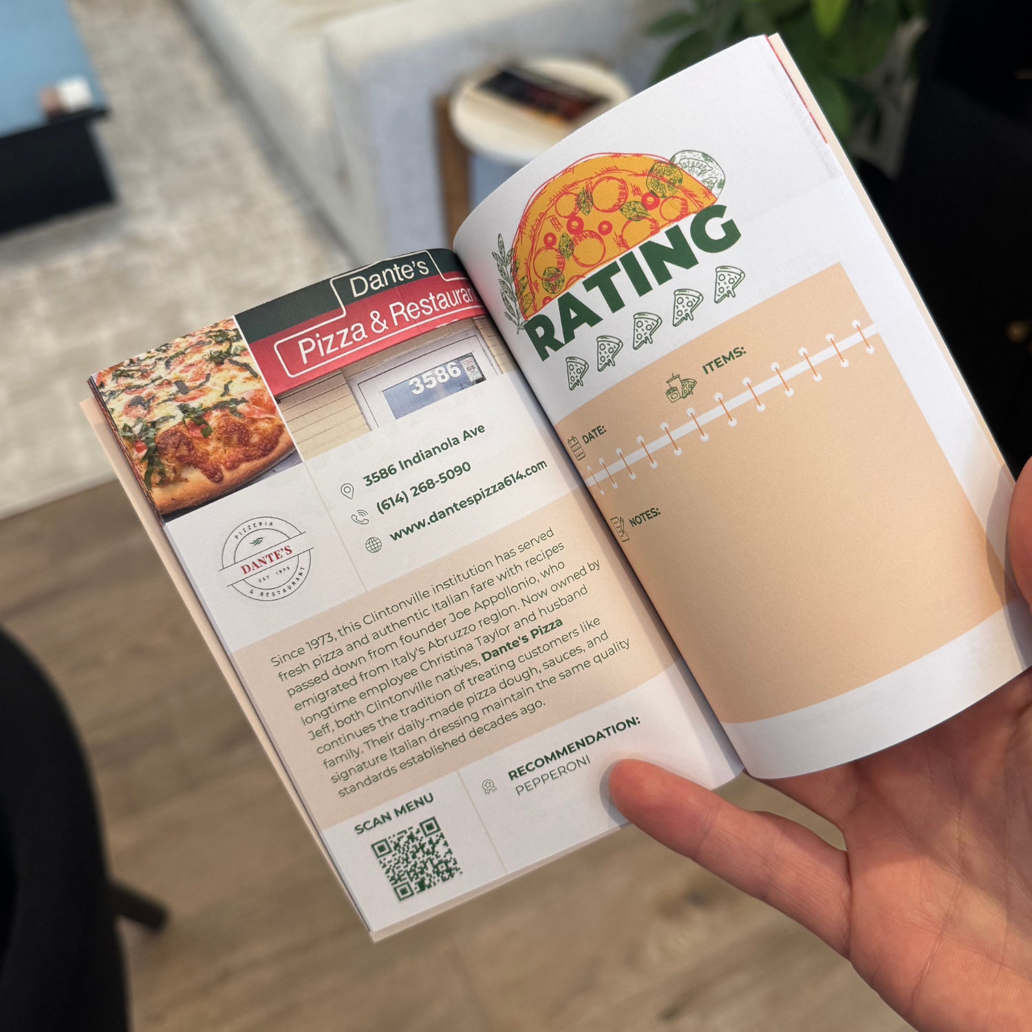 Inspired by our own pizza-fueled adventures, this pocket-sized Pizza Passport highlights handpicked spots all across Columbus. We built it as a fun way to track our favorite slices and push ourselves to try something new. Each pizzeria has its own page with a short description and slice recommendation. Rate each stop, jot down notes, and see how many you can hit. Whether you’re a local or just exploring, this guide gives you the perfect excuse to dive deeper into Columbus’s underrated pizza scene. Bonus: there are blank pages in the back for your own hidden gems and favorites.