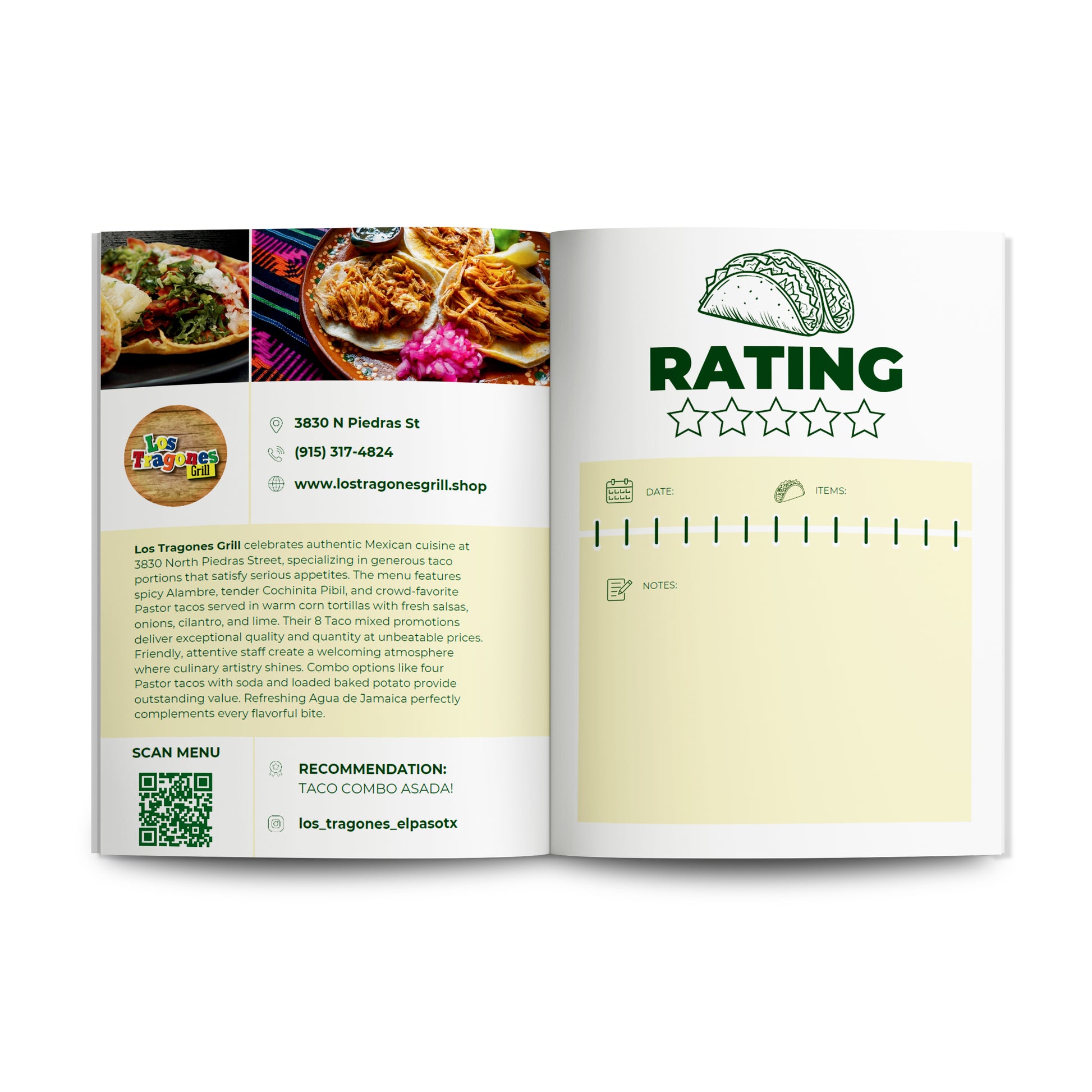 Born from our own taco-filled adventures, this pocket-sized Taco Passport highlights handpicked taquerias across El Paso and the surrounding areas. We created this guide as a fun way to track our favorite spots around the city. Each taqueria has its own dedicated page with a short description and taco recommendation. Rate each spot out of 5, jot down your notes, and challenge yourself to visit them all. Whether you're a local or just visiting, this passport invites you to experience the incredible variety of tacos that makes El Paso so special. We've even included blank pages in the back for hidden gems you discover along the way.