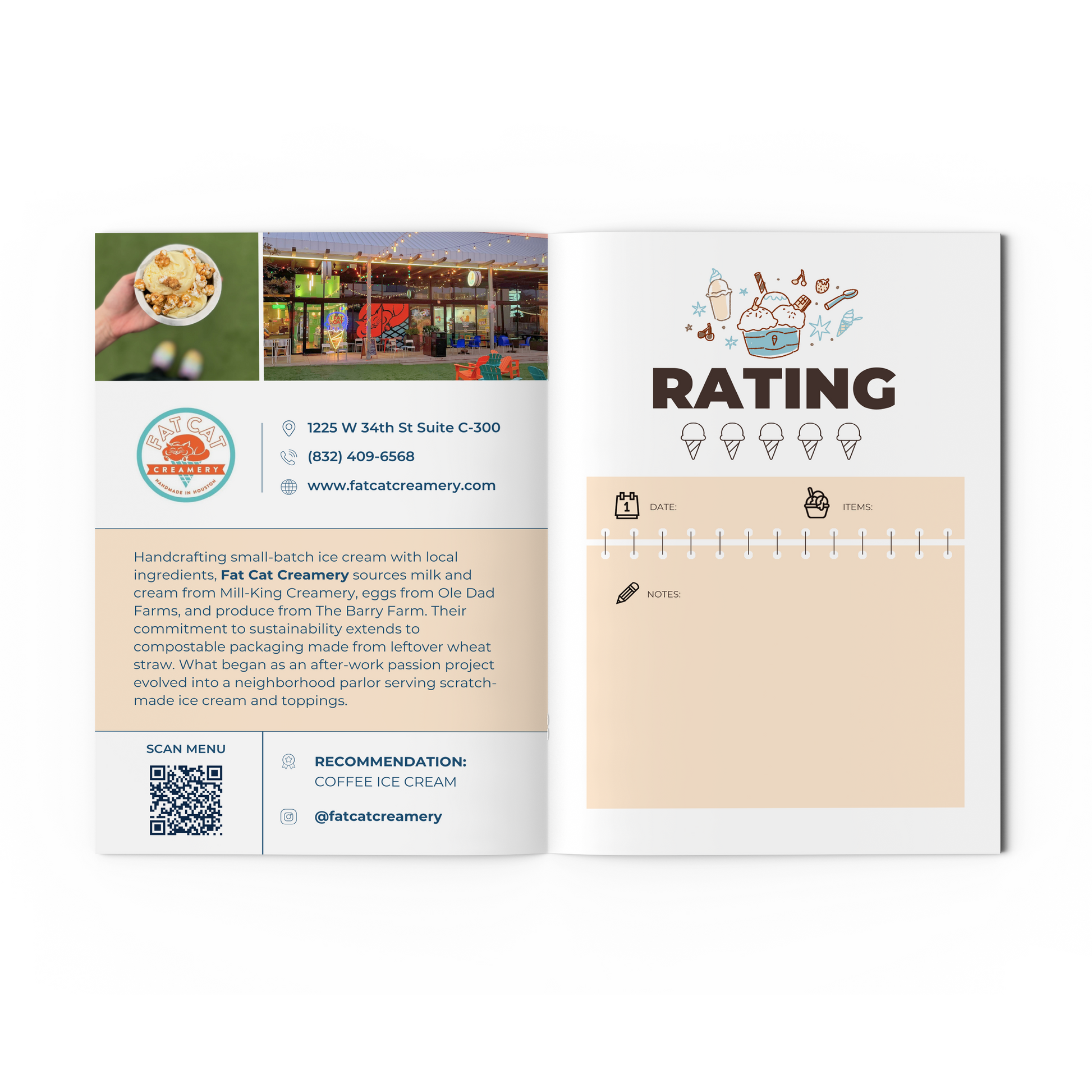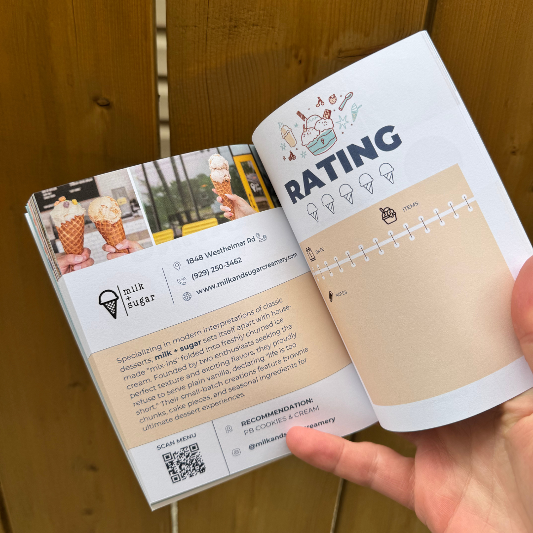 Born from our own sweet-toothed adventures, this pocket-sized Ice Cream Passport features handpicked scoop shops across Houston. We created this guide because we wanted a fun way to document our frozen discoveries around the region. Each ice cream shop has its dedicated page that includes a description and flavor recommendation. Explore a new spot, rate it out of 5, and challenge yourself to visit all scoop shops. Whether you're new to the city or just looking to break your routine, this passport gives you a reason to explore the Houston's diverse ice cream scene while creating lasting memories along the way. We've even left blank spots at the back for you to fill in with different ice cream shops and ones you visit while traveling.