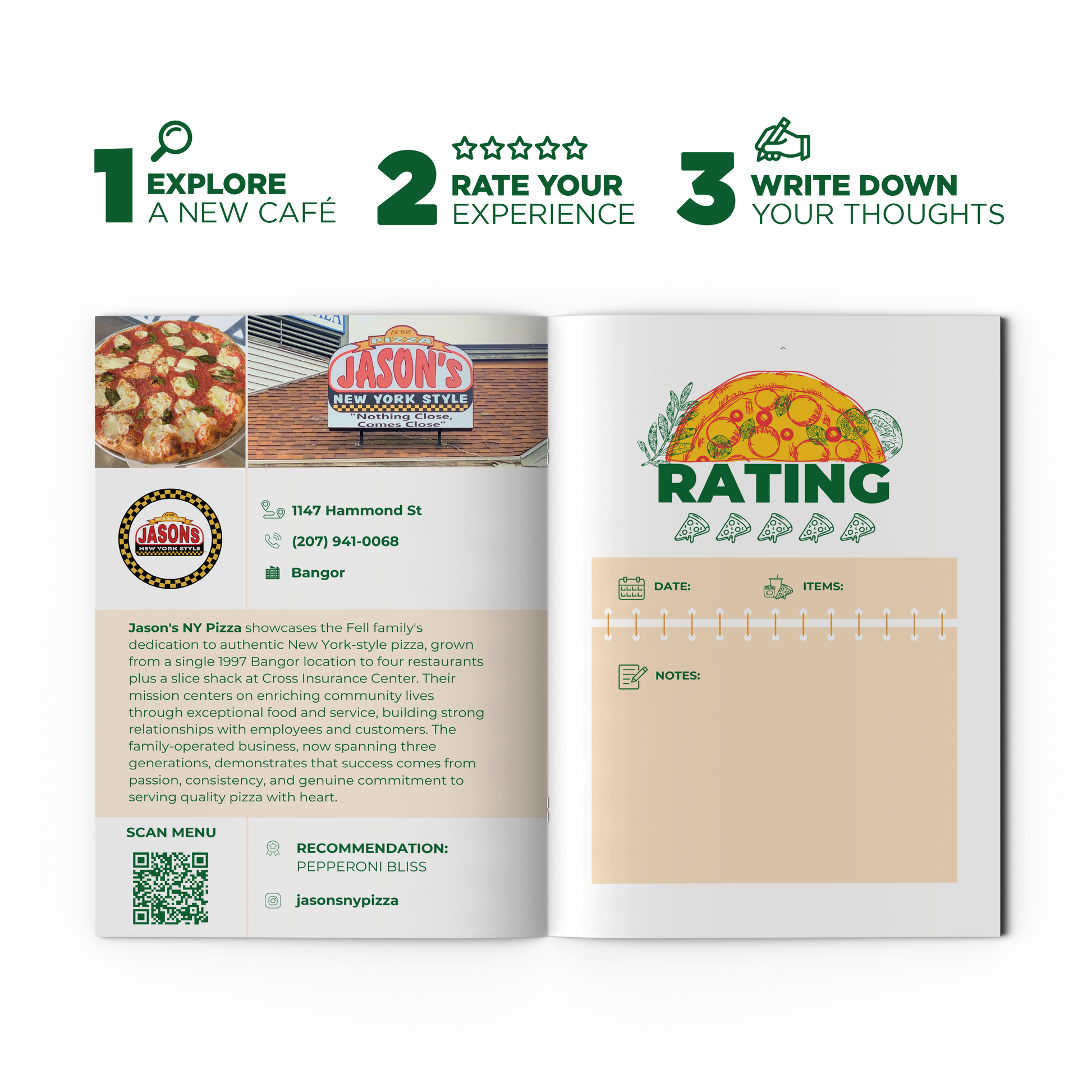 Born from our own slice-filled adventures, this pocket-sized Pizza Passport highlights handpicked pizzerias across Maine. We created this guide as a fun way to track our favorite spots from Portland to Bangor. Each pizzeria has its own dedicated page with a short description and slice recommendation. Rate each spot out of 5, jot down your notes, and challenge yourself to visit them all. Whether you're a local or just passing through, this passport invites you to experience the incredible variety of pizza that makes Maine so special. We've even included blank pages in the back for hidden gems you discover along the way.