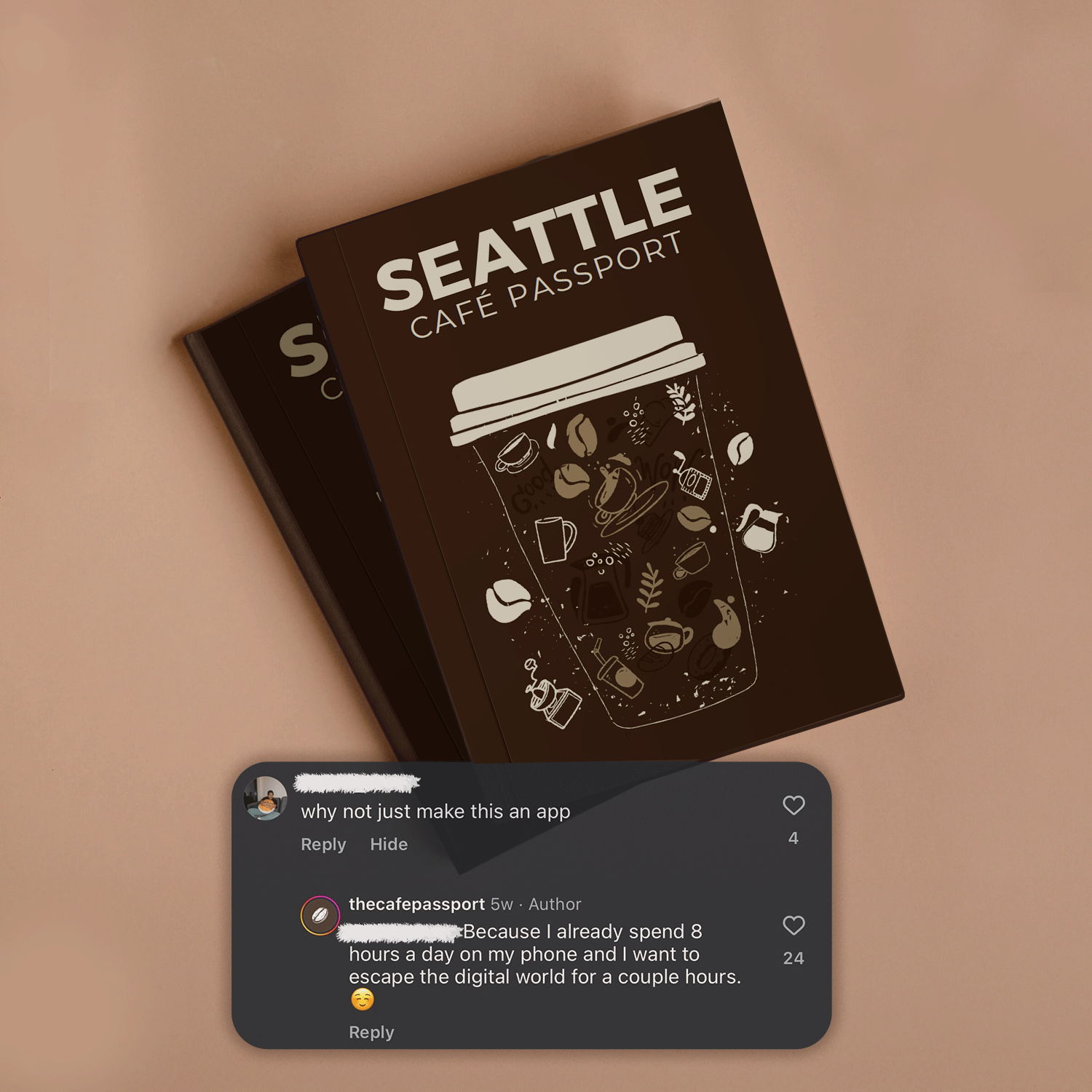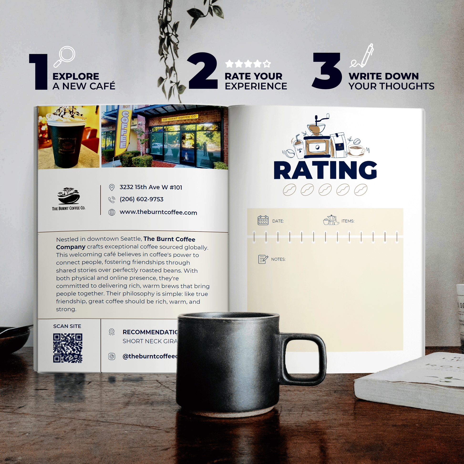 Born from our own caffeine-fueled adventures, this pocket-sized Cafe Passport features 35 handpicked spots across Seattle. We created this guide because we wanted a fun way to document our discoveries around the city. Each cafe has its own dedicated page that includes a description and drink recommendation. Explore a new spot, rate it out of 5, and challenge yourself to visit all 35 cafes. Whether you're new to town or just looking to break your routine, this passport gives you a reason to explore Seattle's diverse coffee scene while creating lasting memories along the way. We've even left blank spots at the back for you to fill in with different cafes and ones you visit while traveling.