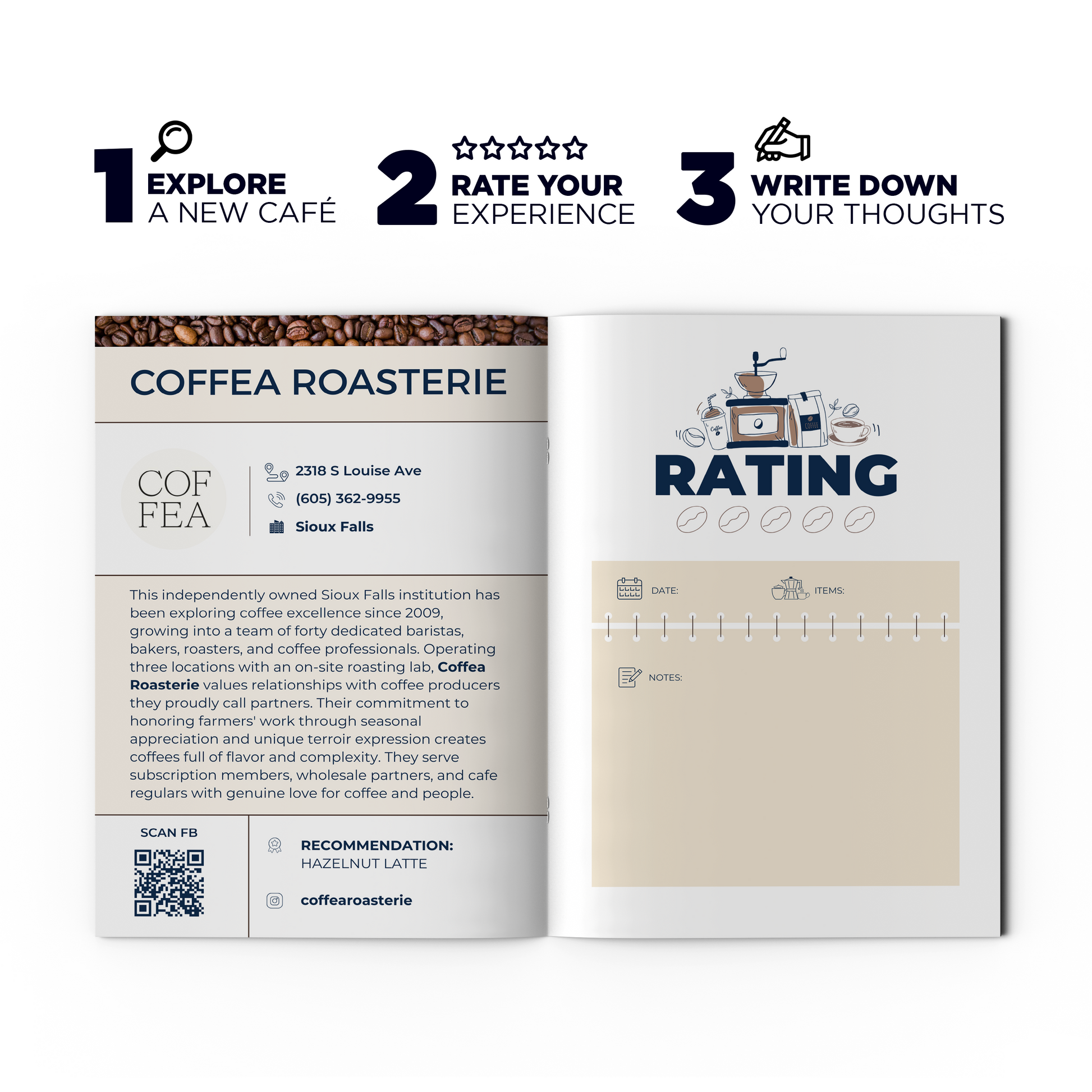Born from our own caffeine-fueled adventures, this pocket-sized Cafe Passport features handpicked spots across South Dakota. We created this guide because we wanted a fun way to document our discoveries around the state. Each cafe has its own dedicated page that includes a description and drink recommendation. Explore a new spot, rate it out of 5, and challenge yourself to visit all the cafes. Whether you're new to town or just looking to break your routine, this passport gives you a reason to explore South Dakota's vibrant coffee scene while creating lasting memories along the way. We've even left blank spots at the back for you to fill in with different cafes and ones you visit while traveling.