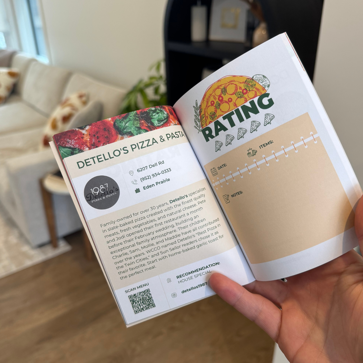 Born from our own slice-filled adventures, this pocket-sized Pizza Passport highlights handpicked pizzerias across the Twin Cities and surrounding areas. We created this guide as a fun way to track our favorite spots around Minneapolis and St. Paul. Each pizzeria has its own dedicated page with a short description and slice recommendation. Rate each spot out of 5, jot down your notes, and challenge yourself to visit them all. Whether you're a local or just visiting, this passport invites you to experience the incredible variety of pizza that makes the Twin Cities so special. We've even included blank pages in the back for hidden gems you discover along the way.